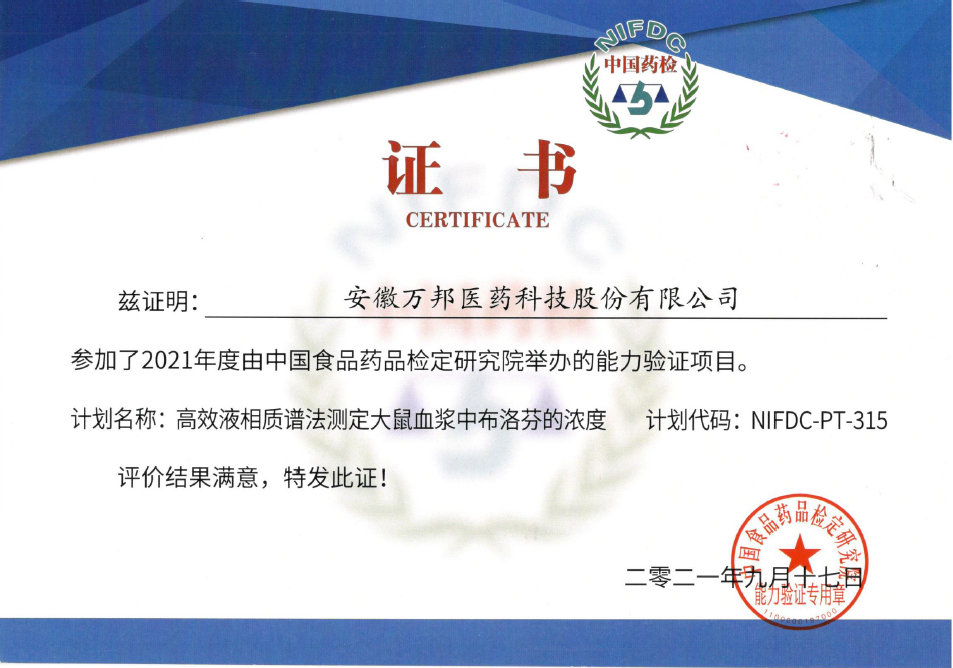 我司生物樣本分析部參加2021中國(guó)食品藥品檢定研究院舉辦的能力驗(yàn)證項(xiàng)目,并再次取得榮譽(yù)證書(shū)。
