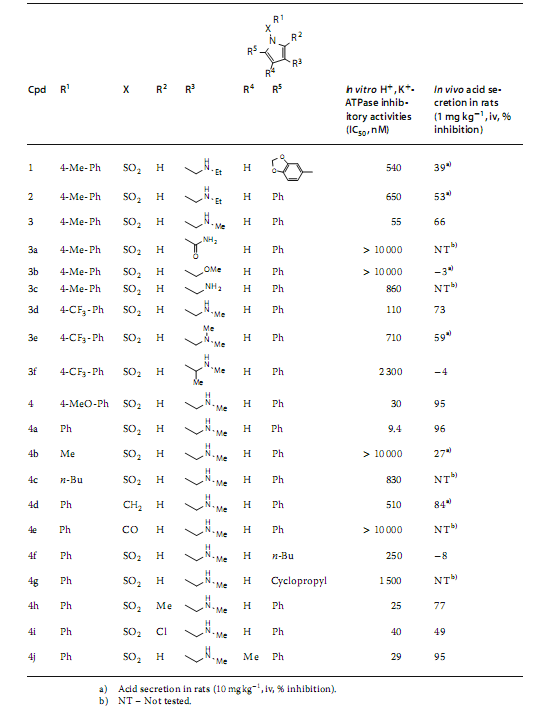 研究者評估了命中化合物的潛力,對吡咯衍生物進行了合成研究,并評估了構效關系(SAR)(見圖3)(表1)[3]。首先,合成化合物2以證明吡咯環5位上的堿性SAR(必需的亞結構),使得化合物活性得以維持。接下來,當3-位上的N-乙基氨基甲基變為N-甲基氨基甲基時,其活性在體外增加超過十倍。另外,化合物3(1mg▪kg-1,靜脈內)在大鼠中抑制66%的酸分泌。與Na+,K+-ATP酶相比,它還顯示出對H+,K+-ATP酶的高選擇性。此外,動力學研究表明H+,K+-ATP酶相對于K+的競爭性抑制,表明該化合物是P-CAB。因此,隨著其對酶的活性增加導致顯著的酸分泌抑制,以及高的酶選擇性,化合物可能是作為P-CAB的一款有期望的酸抑制的良好候選物。