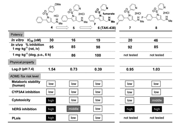 因此,研究者選擇化合物6(TAK-438,富馬酸伏諾拉生)作為開發的候選化合物(見圖5)。