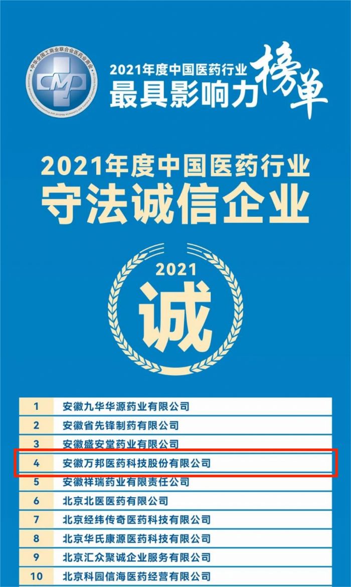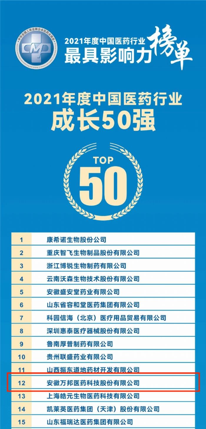 近日,全國(guó)工商聯(lián)醫(yī)藥業(yè)商會(huì)發(fā)布了2021年度中國(guó)醫(yī)藥行業(yè)最具影響力榜單,安徽萬(wàn)邦醫(yī)藥科技股份有限公司喜獲2021年度“中國(guó)醫(yī)藥行業(yè)成長(zhǎng)50強(qiáng)”,“中國(guó)醫(yī)藥研發(fā)50強(qiáng)”、“中國(guó)醫(yī)藥行業(yè)守法誠(chéng)信企業(yè)”這也是安徽萬(wàn)邦醫(yī)藥自2017年以來(lái)連續(xù)多年獲此殊榮!