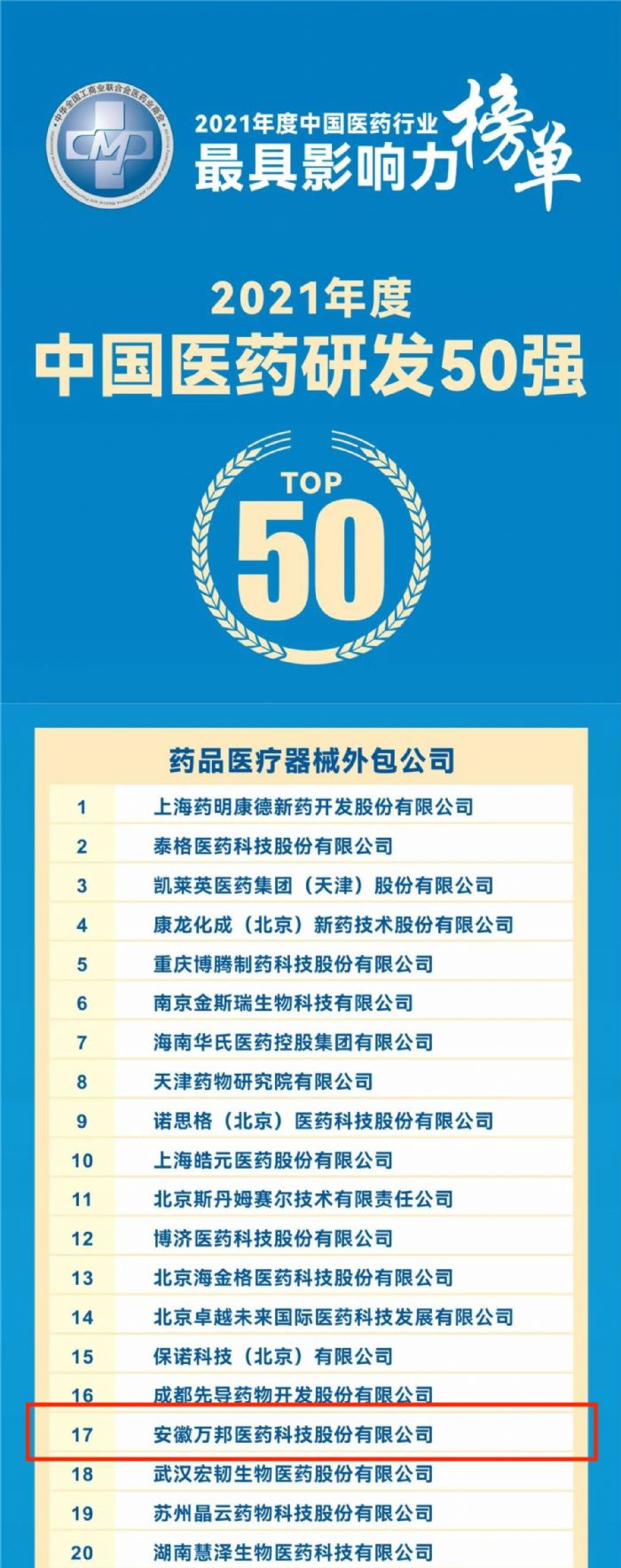安徽萬(wàn)邦醫(yī)藥2017年-2019年已連續(xù)三年榮獲“中國(guó)醫(yī)藥外包公司20強(qiáng)”;2021年起,評(píng)選按照不同分類拓展為“中國(guó)醫(yī)藥研發(fā)50強(qiáng)”,安徽萬(wàn)邦醫(yī)藥已連續(xù)兩年榮獲“中國(guó)醫(yī)藥研發(fā)50強(qiáng)”、連續(xù)四年獲得“中國(guó)醫(yī)藥行業(yè)守法誠(chéng)信企業(yè)”。