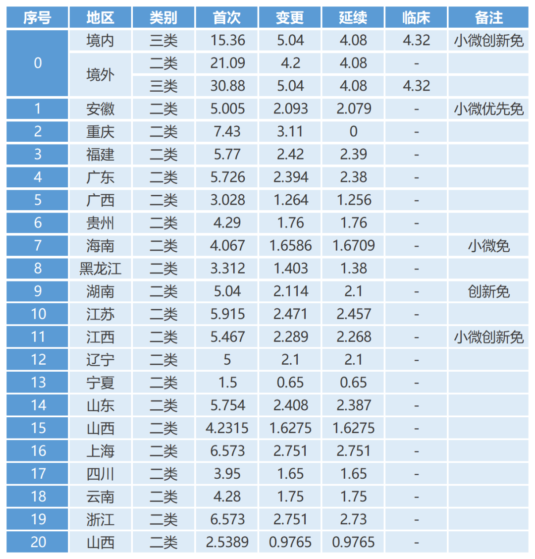 備注:注冊收費單位為萬元。北京、天津、內蒙、河北、河南、陜西、湖北、吉林、新疆、西藏、青海注冊不收費。