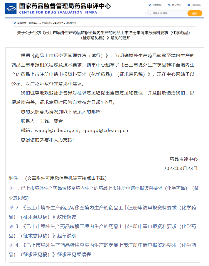 法律法規|CDE公開征求《已上市境外生產藥品轉移至境內生產的藥品上市注冊申請申報