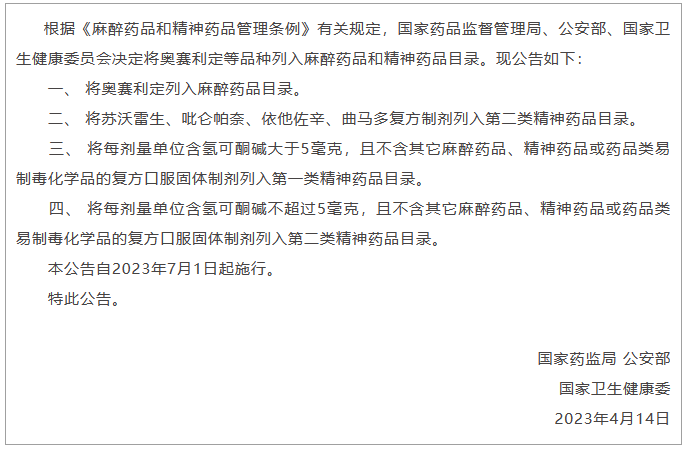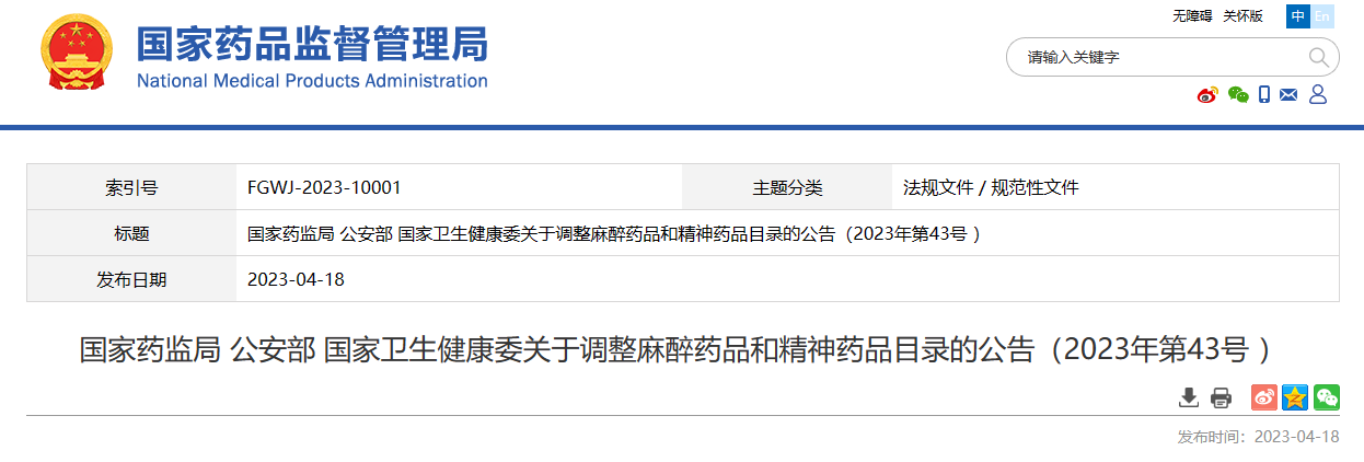 法律法規|NMPA發布關于調整麻醉藥品和精神藥品目錄的公告