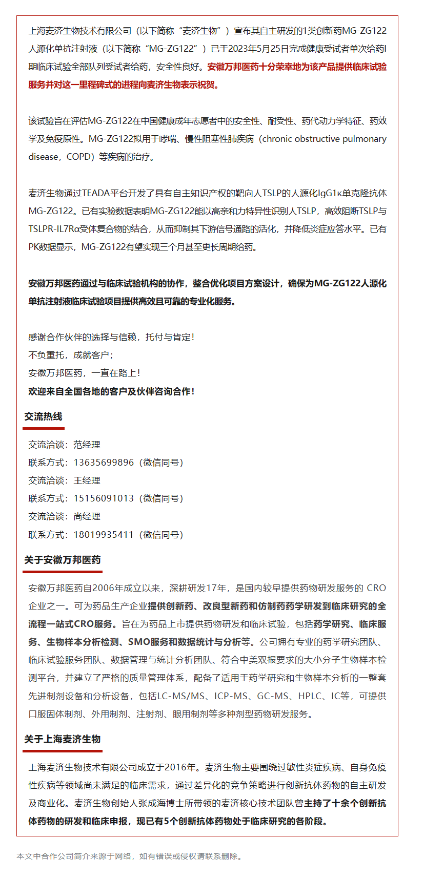 喜訊|安徽萬邦醫(yī)藥助力麥濟(jì)生物MG-ZG122人源化單抗注射液完成Ⅰ期臨床給藥