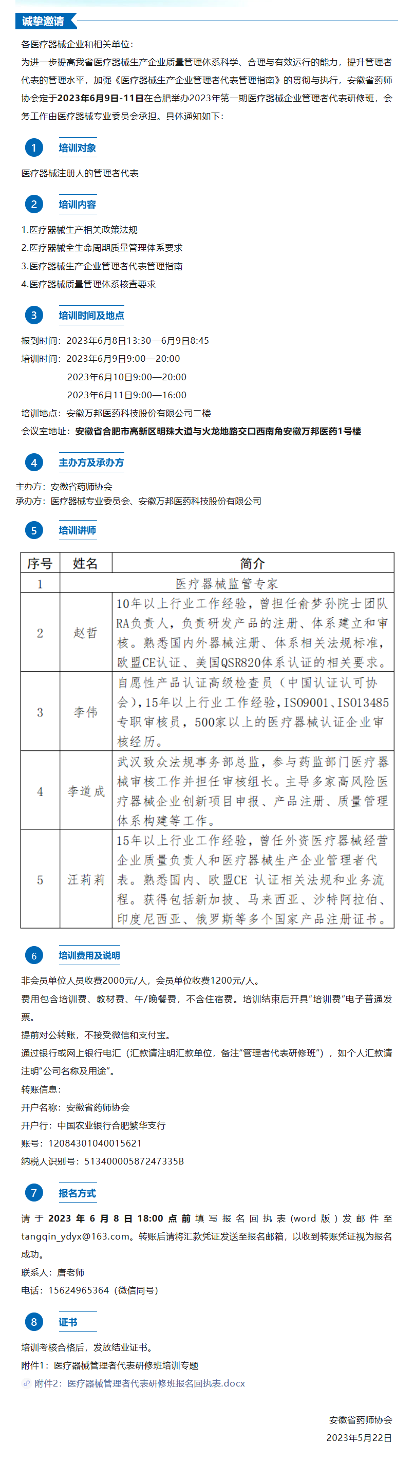 安徽省藥師協會醫療器械企業管理者代表研修班首期開班啦!
